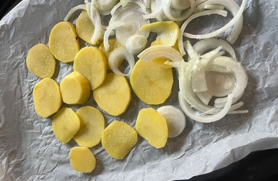 Ochutenie: V miske (alebo priamo na plechu vystlanom papierom na pečenie) zemiaky a cibuľu zmiešajte s olivovým olejom, soľou, korením a bylinkami.